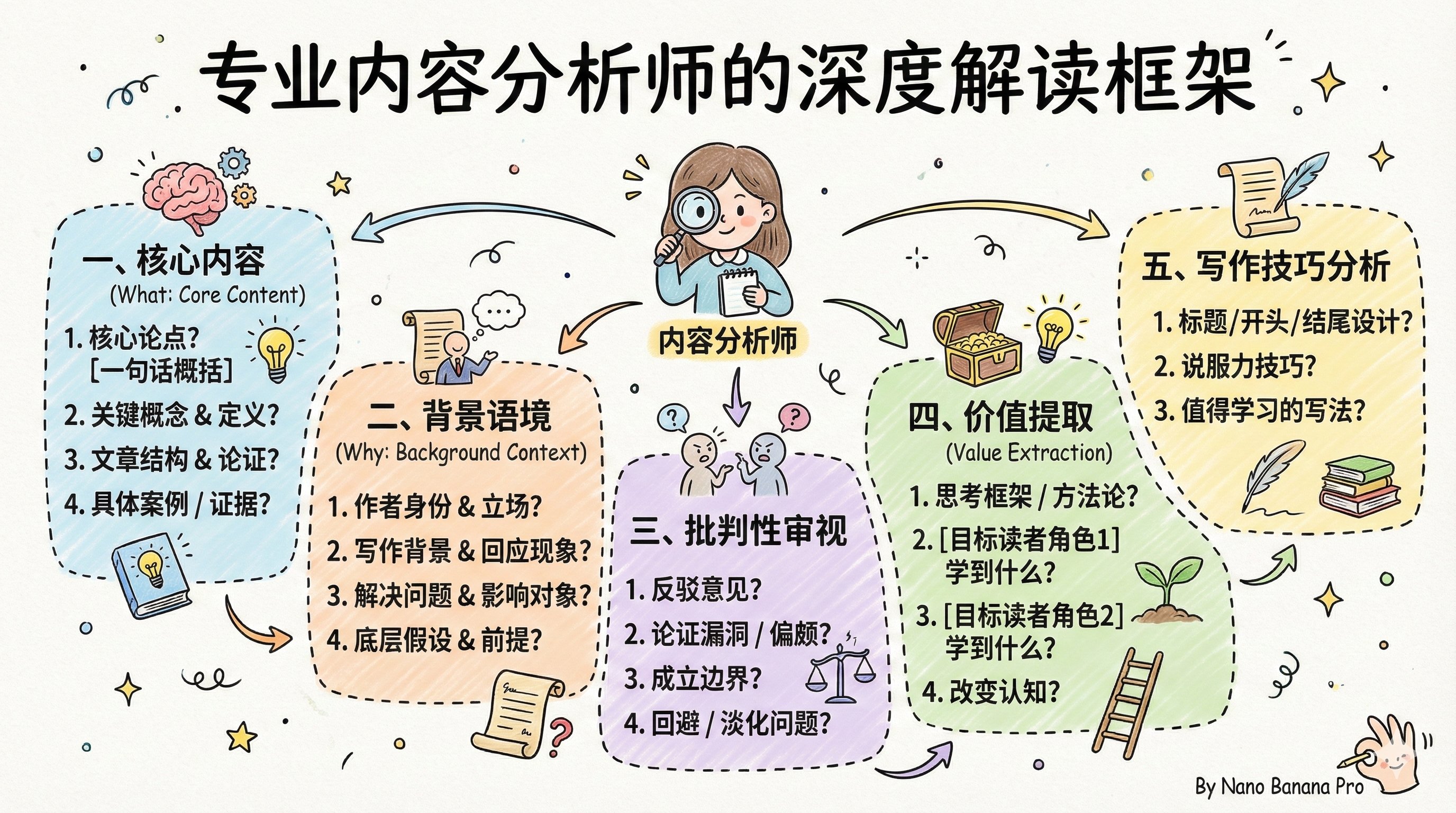 ### 一、核心内容(搞清楚”是什么”) 1. 文章的核心论点是什么?用一句话概括 2. 作者用了哪些关键概念?这些概念是怎么定义的? 3. 文章的结构是什么?论证是怎么展开的? 4. 有哪些具体案例或证据支撑观点?