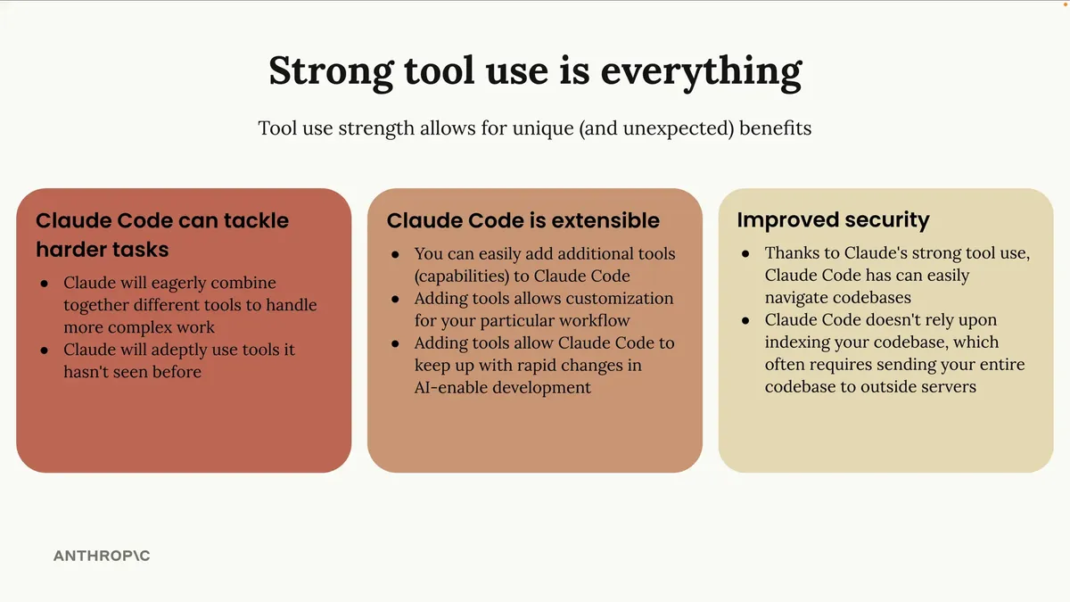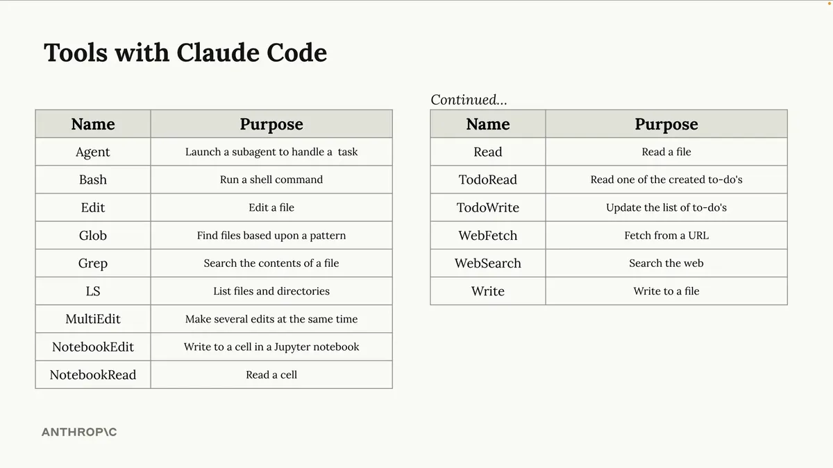 就在刚才,我做出了相当大胆的声明——声称Claude是运用工具的专家,且Claude代码极易上手。您难免会有所怀疑,因此我想通过几个快速演示来说明。这张桌上摆放的是Claude代码默认可用的工具集,它具备所有您期望的功能:读取文件、写入文件、运行命令等等。