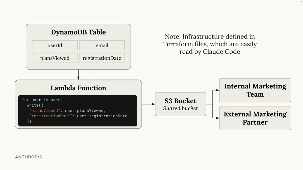 云代码非常清楚信息是如何在我们的基础设施中流动的。现在,假设这个应用中有一个DynamoDB表。如果不熟悉这种表,可以把它理解为一种常规的数据库表。里面存储了关于用户的一些不同信息,可能包括查看过的方案和注册日期。