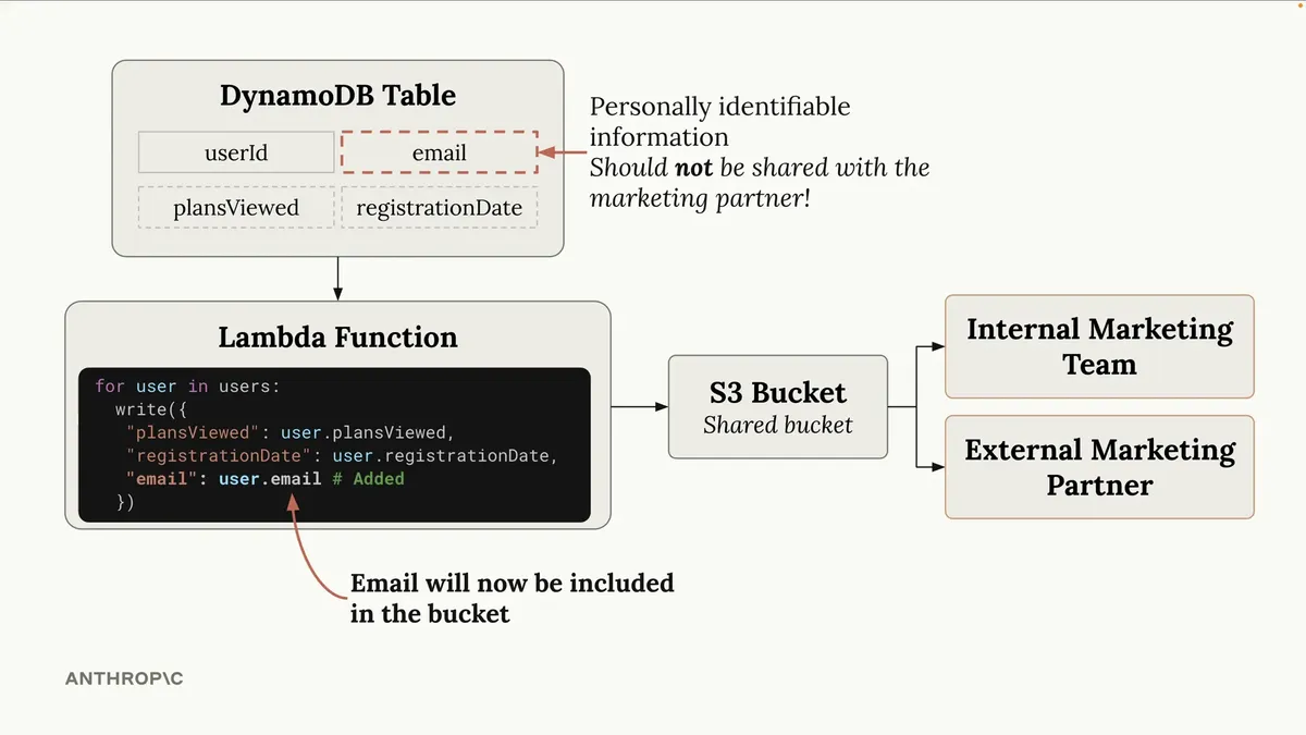 因此,我们可能会进入Lambda函数,仅添加一行代码来获取用户的电子邮件并将其存储在那个存储桶中。由于这是几个月后的事情,我们可能已经完全忘记这个S3存储桶是与外部营销合作伙伴共享的。