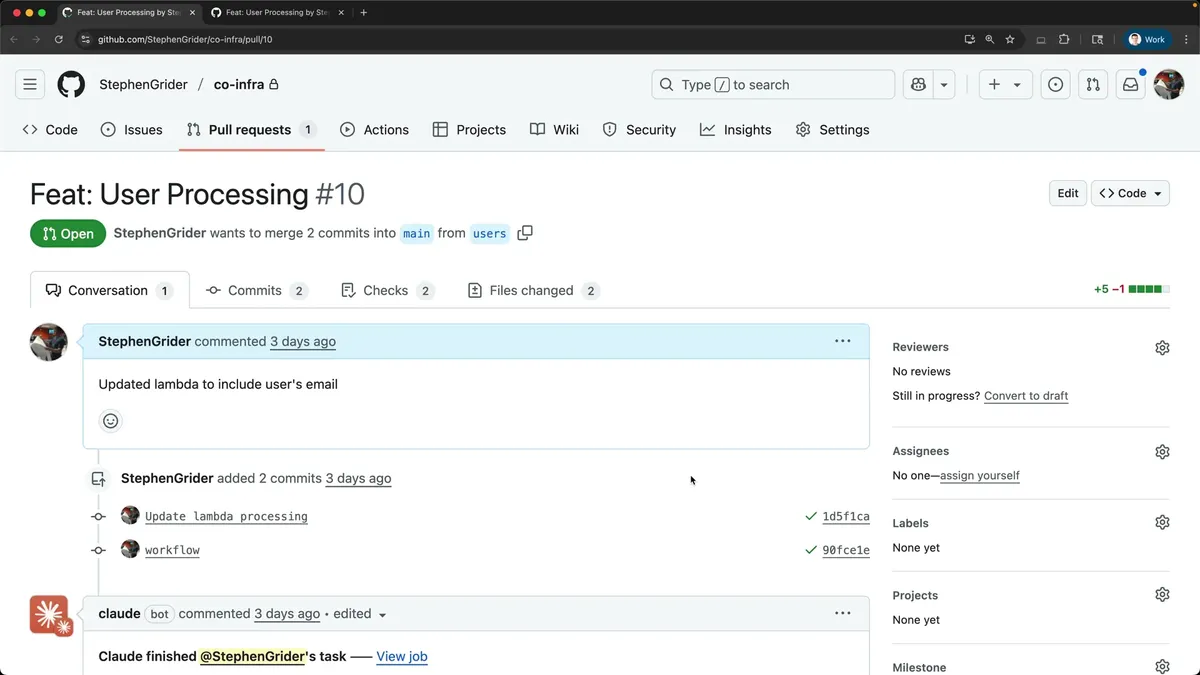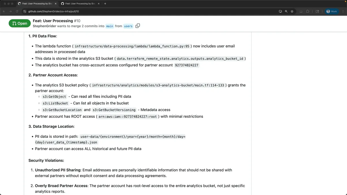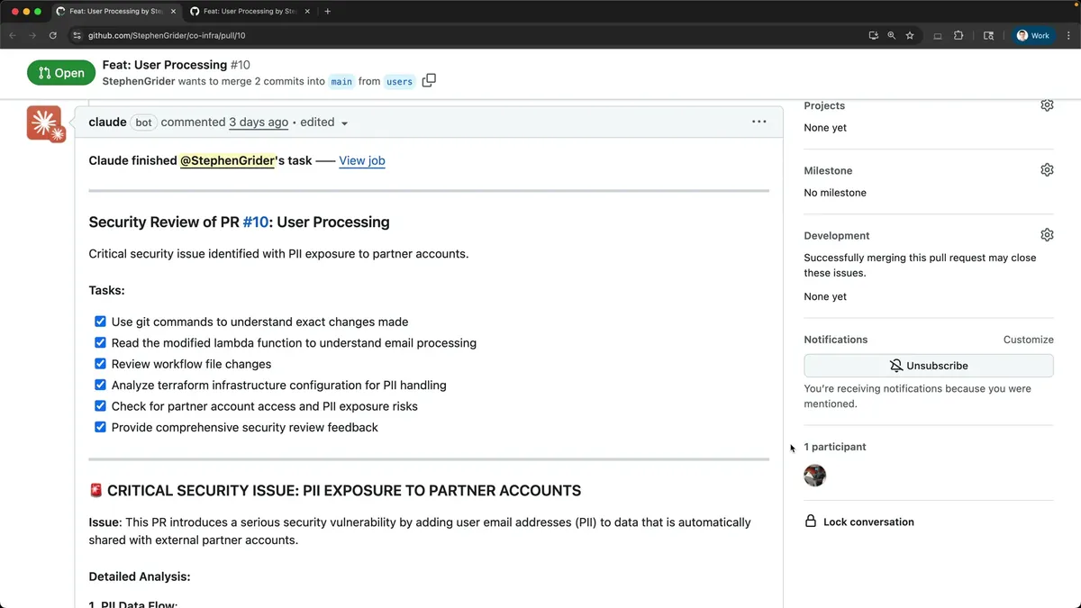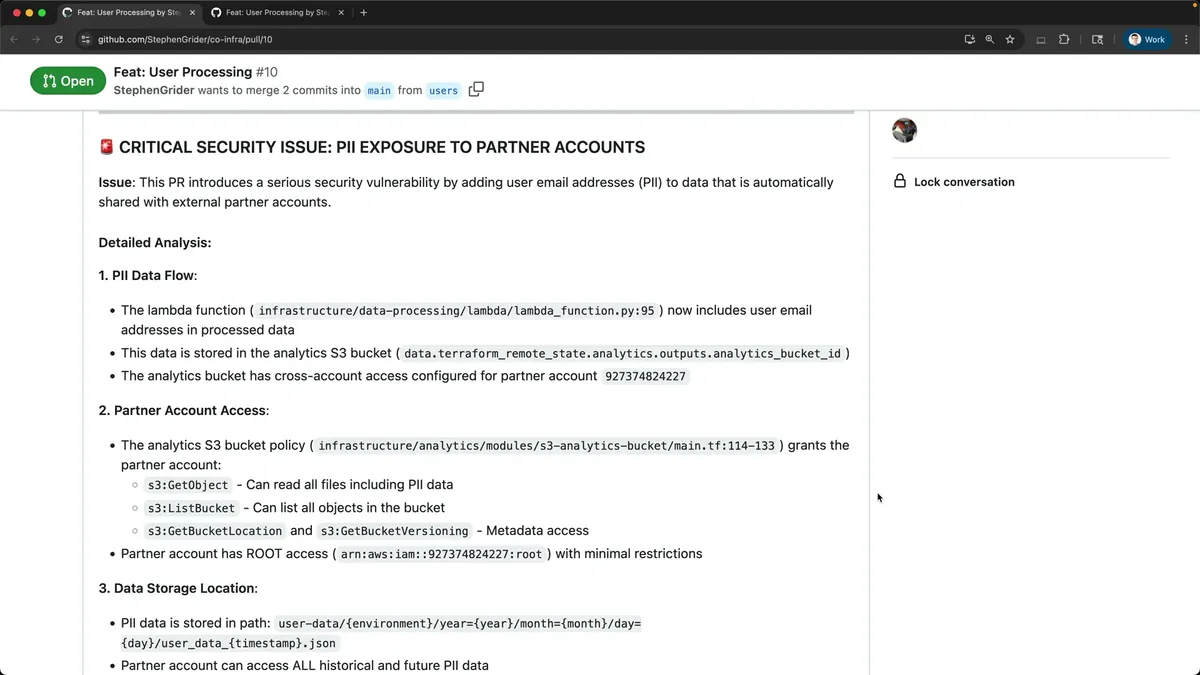 现在,Cloud Code对我的基础设施有着出色的理解能力,因此它能够——在我们此刻看到的自动化审查中——检查我在这个拉取请求中所做的所有变更。