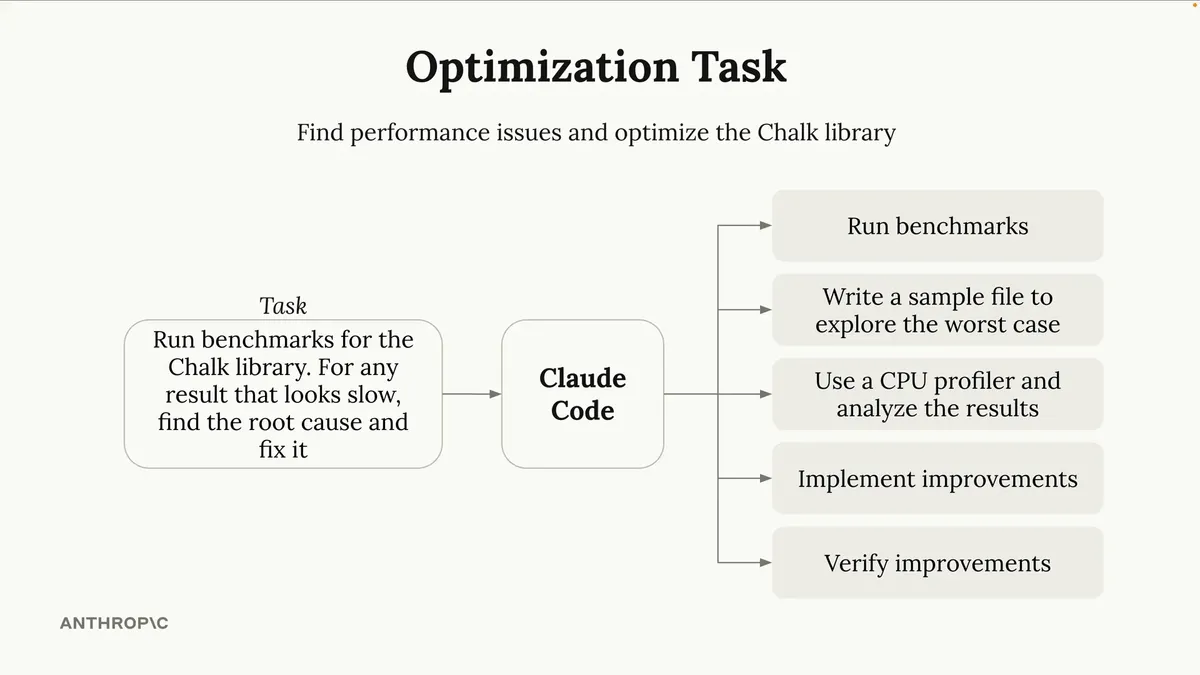 我们将看到Claude会运用多种不同的工具来智能地解决这个问题。它会制定一份待办清单来追踪进度,执行命令运行基准测试,编写文件以更精准地聚焦某个特定案例,使用CPU性能分析器来理解该案例运行缓慢的根源,最后实施一些优化措施。