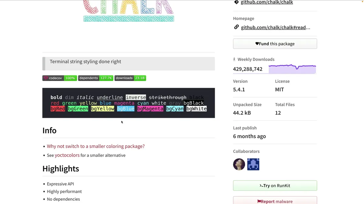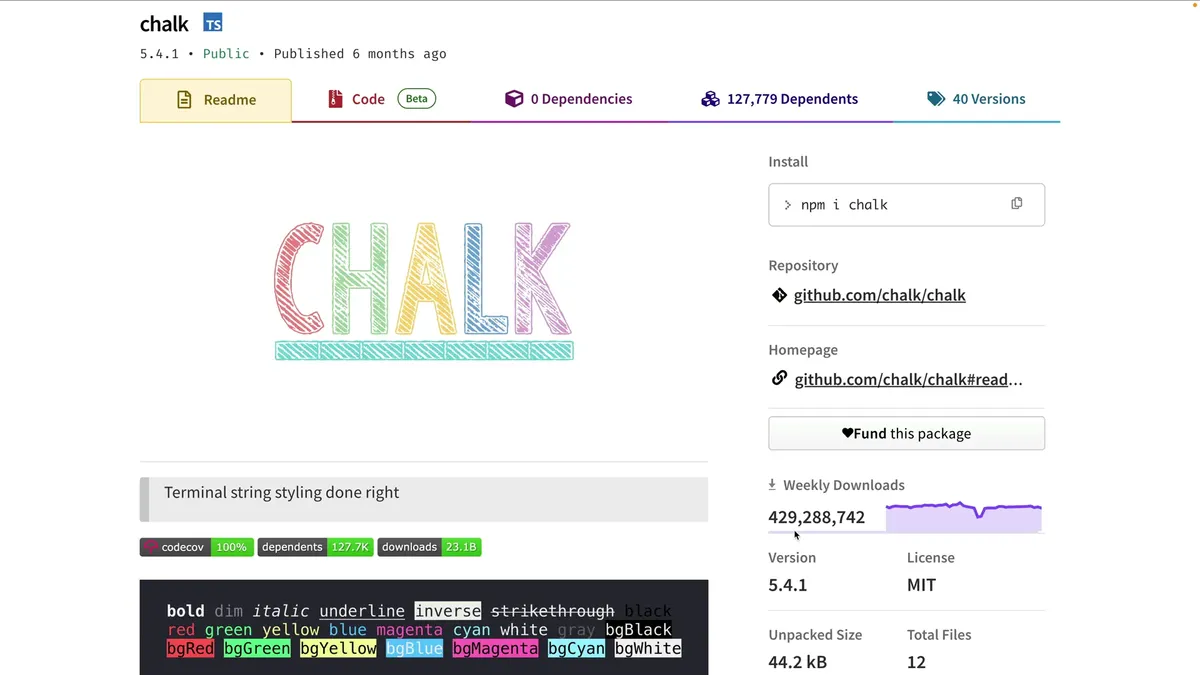所以你可以给文本添加颜色、背景等等诸如此类的样式。现在这听起来可能像个非常简单甚至有点傻的包,但关键在于——这个包实际上是整个JavaScript生态系统中下载量第五大的包。特别是上周,它的下载量达到了4.29亿次。这个包被广泛使用。简单来说,如果我能在其中找到任何可以优化的地方…