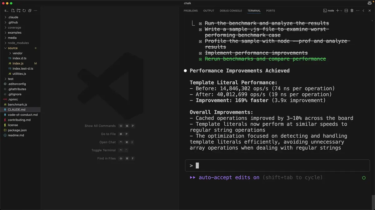 现在展示第一个任务:我将要求Claude代码查找并优化Chalk库的性能问题。您可能不太熟悉,Chalk其实是一个JavaScript工具包。