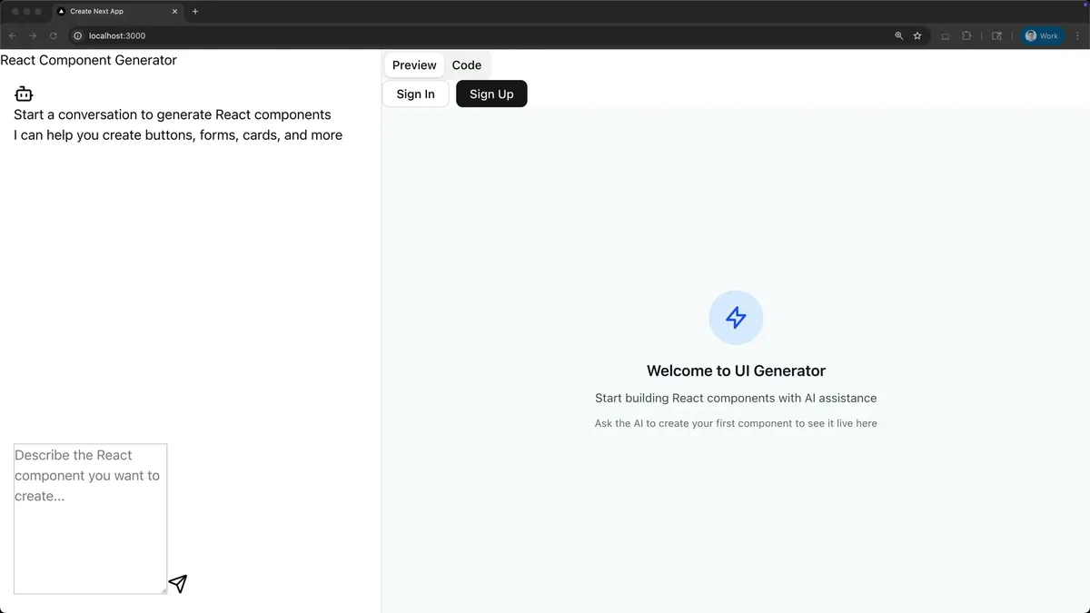 我开发了一个小应用,它能够根据屏幕左侧输入的文字描述自动生成UI组件,生成的组件会实时显示在右侧。目前该应用可以轻松生成美观的组件,但左侧的聊天界面和顶部的标题栏看起来还不够精致,所以我准备通过云代码来优化样式设计。