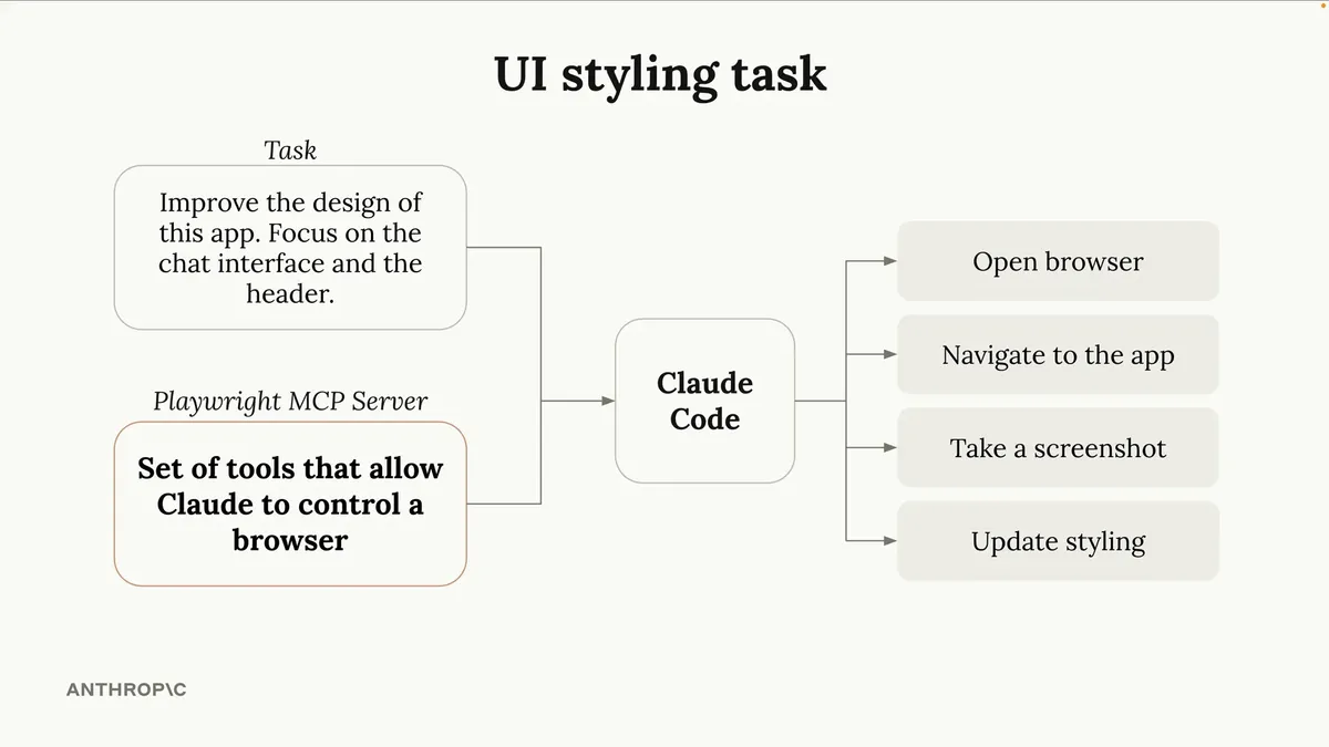 如果我只是单纯要求它修复聊天界面顶部的样式问题,它可能也能出色完成任务。但请记住,我此刻的目标是向您展示如何轻松地为Claude Playwright增添新功能。因此在处理样式任务的同时,我还会为Claude Playwright接入一个名为MCP服务器的新工具集(具体细节稍后详解),这些工具能让Claude直接操控浏览器窗口。