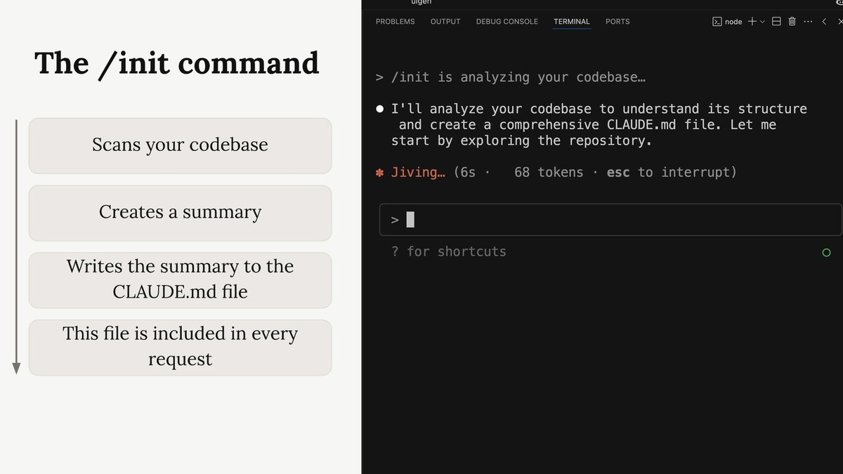 在新项目中首次启动 Claude 时,运行 /init。这会让 Claude 分析整个代码库并理解: